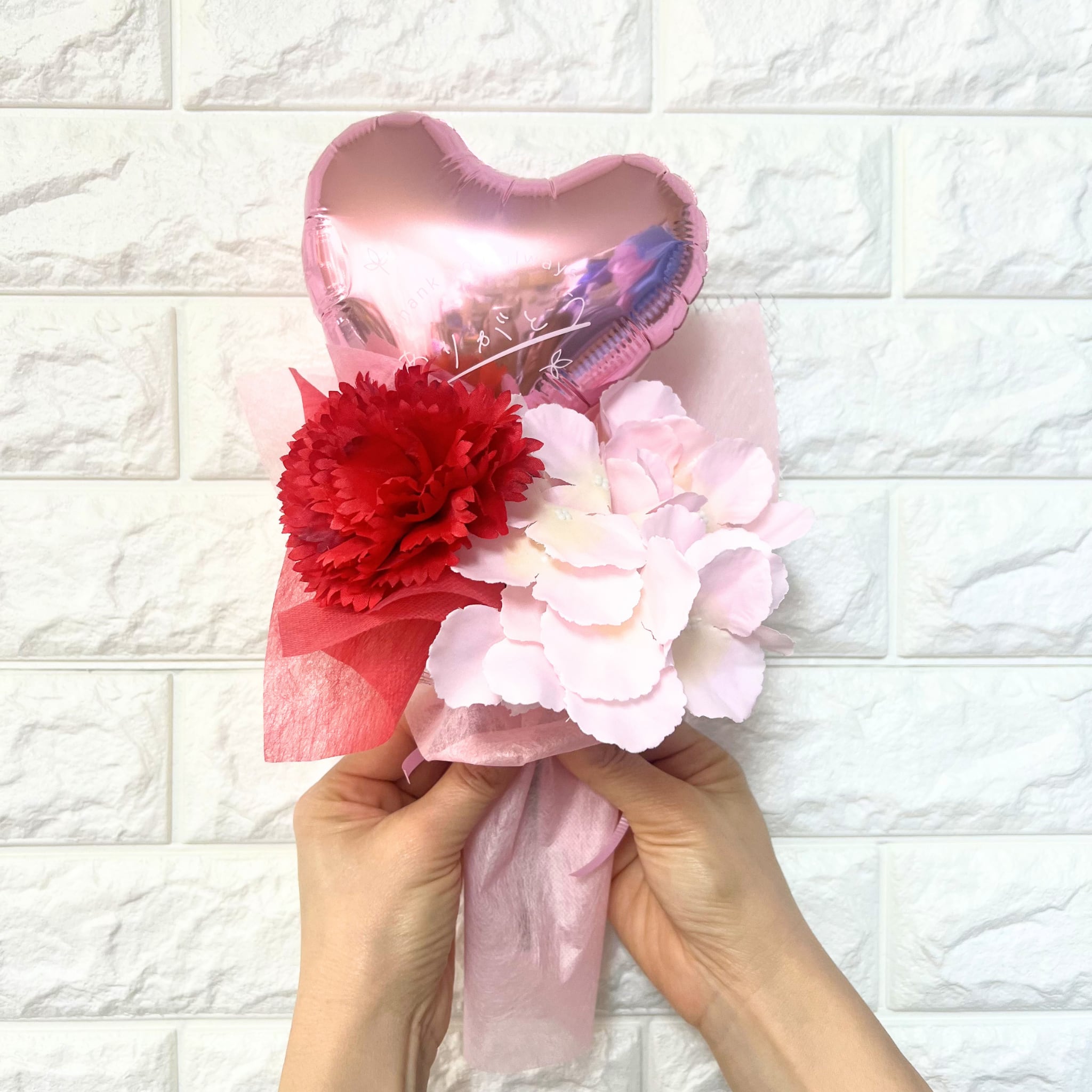 大きなバルーンに「ありがとう」のメッセージが描かれており、お母さまへの感謝の気持ちを表現します。